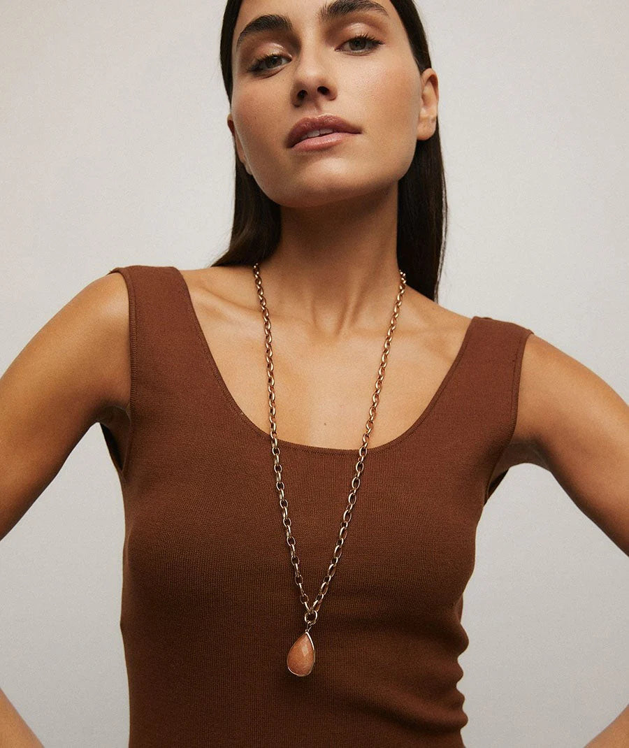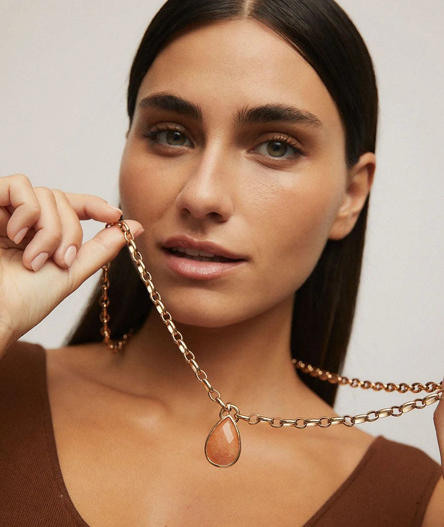 El Colgante Sió de la colección Dreams está chapado en Oro de 18kt. Este elegante colgante presenta una vibrante Aventurina Naranja, que destaca por su tonalidad naranja intensa. La pieza se completa con una cadena de 80 cm que realza su sofisticado diseño. Perfecto para añadir un toque de color a cualquier conjunto con un estilo refinado y distinguido.