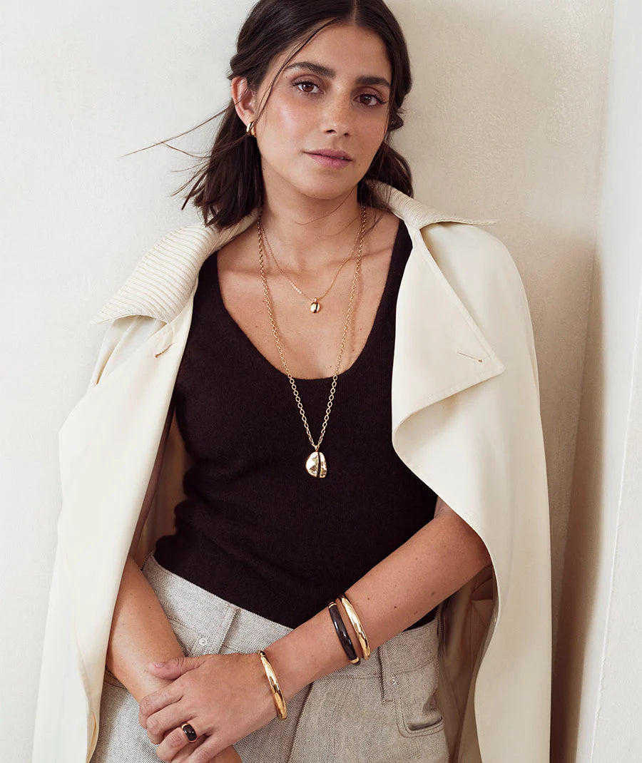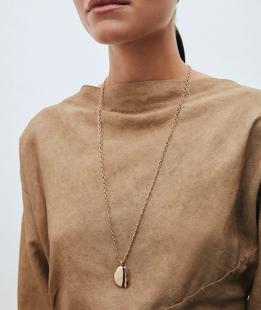 Colgante oval irregular maxi Horizonte maxi bañado con una gruesa capa de oro macizo de 18 kt, lo que garantiza una mayor durabilidad. Destaca por la piedra Esmaltes en tono marrón chocolate, color protagonista de la temporada, que aporta textura, brillo y un gesto de estilo propio. Tiene una longitud de 75 cm. De la Colección MA de María G. de Jaime, que nace de una búsqueda intima para capturar esa luz que aparece en los momentos más sutiles y que habita en cada una de nosotras. Piezas con intención, con formas puras y juegos de contrastes, que nos acompañan a diario y encuentran su lugar de forma natural. Porque la verdadera elegancia no deslumbra, simplemente brilla porque tiene sentido.
