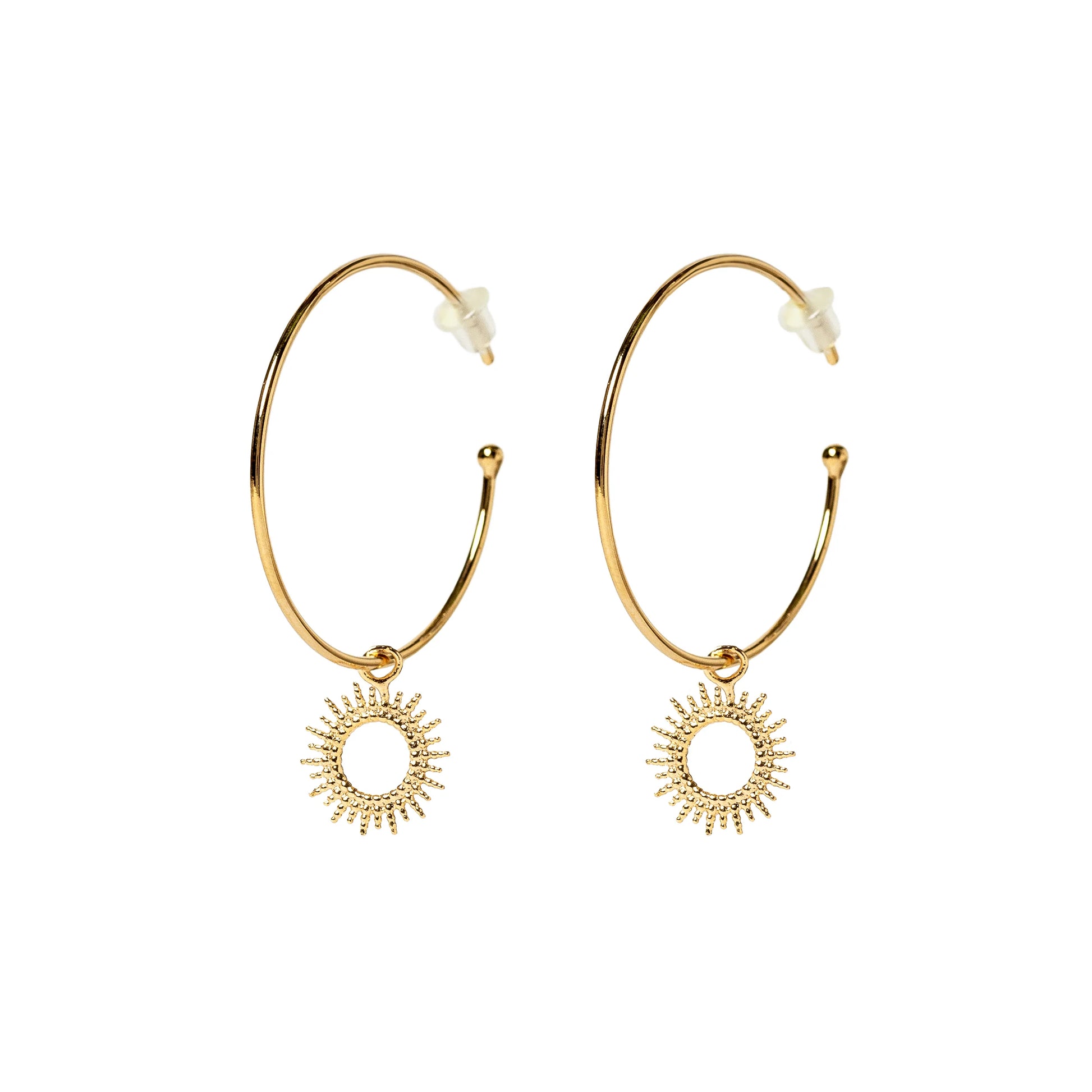 Los Aros Chloe Gold chapados con 3 micras de oro de 18 quilates ofrecen un brillo de lujo duradero con el uso adecuado. Adornados con un charm en forma de sol, son la pieza perfecta para completar tu look.