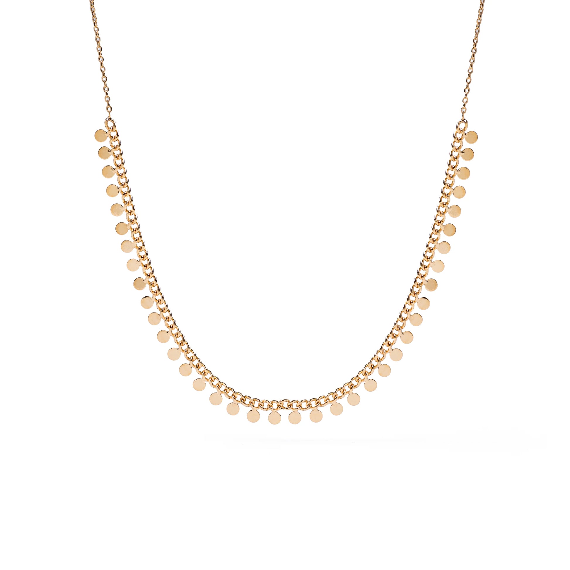 La gargantilla Lucía está formada por una cadena ajustable adornada con pequeñas placas chatas en el centro.